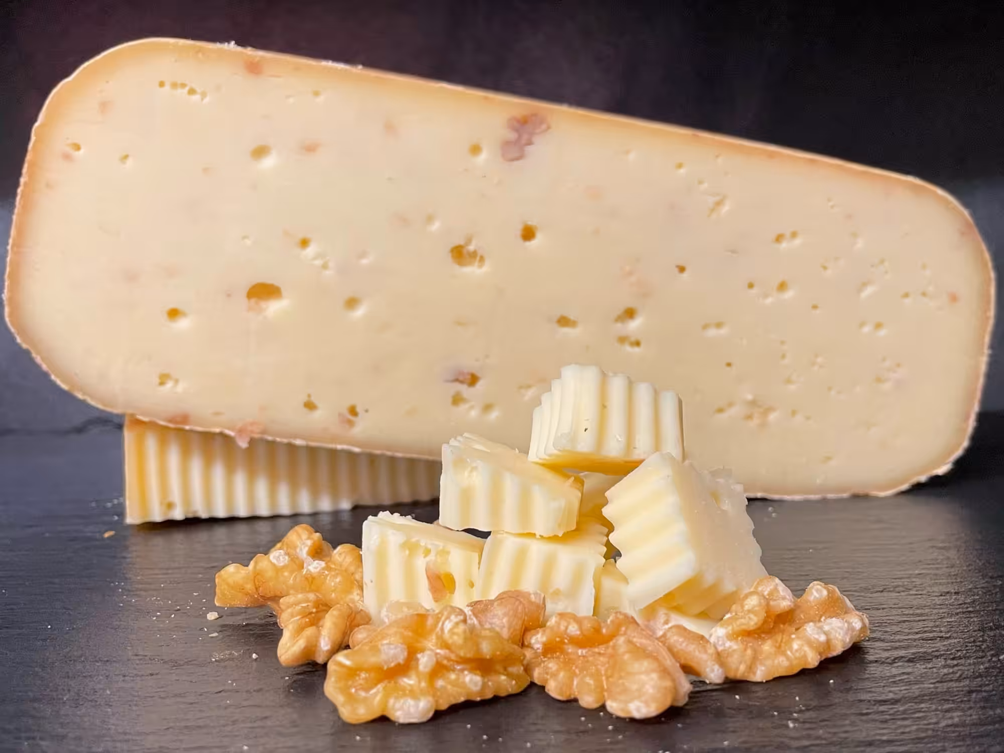 Liebst auch Du die häufig gewählte Komposition aus rahmigen Käse und knackigen Walnüssen? Im Crottendorfer Walnuss-Schnittkäse kannst Du diese zwei Komponenten perfekt miteinander verbunden in einer mild nussigen Käse-Köstlichkeit erleben. Die grob gehackten vitaminreichen Nüsse bringen einen leicht nussigen Geschmack dezent zur Geltung und passen so ideal zu einem Käse-Arrangement mit frischer Birne und fruchtiger Physalis. Ein echter Gaumenschmaus!